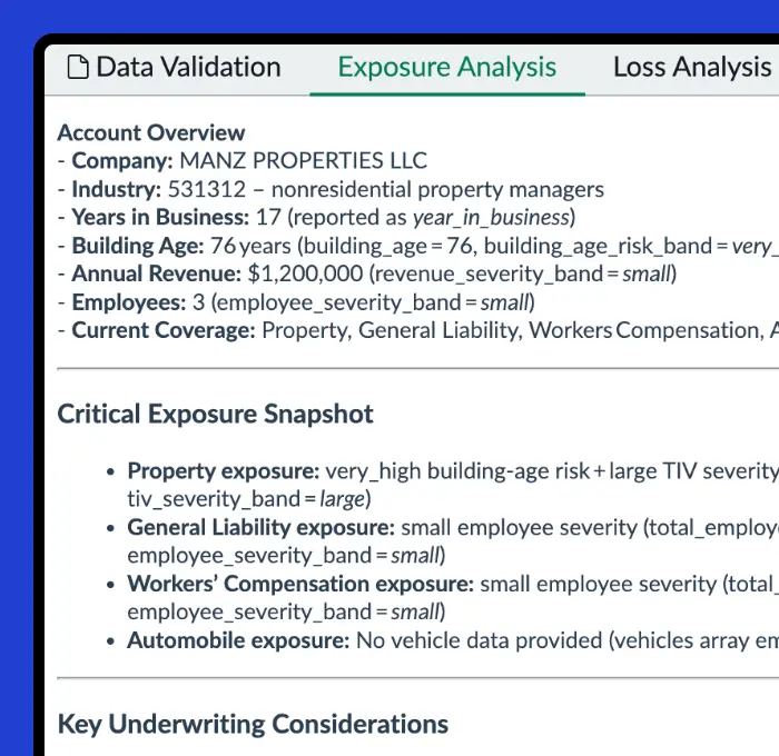 • Normalizes ACORDs, PDFs, Excel schedules, emails, and unstructured text